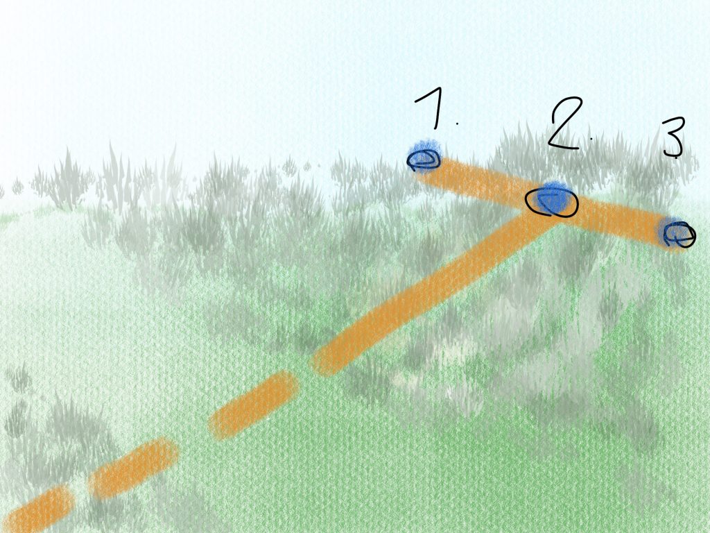 Börja från mitten och sänd från target 2 till target 1, från target 1 till 2, från 2 till 3 osv. För varje skick gäller ”blås stopp gå dit och belöna minst 3 gånger, kasta fri. Belöna att hunden kommer tillbaka med minst 3-4 bitar. Innan du sänder.