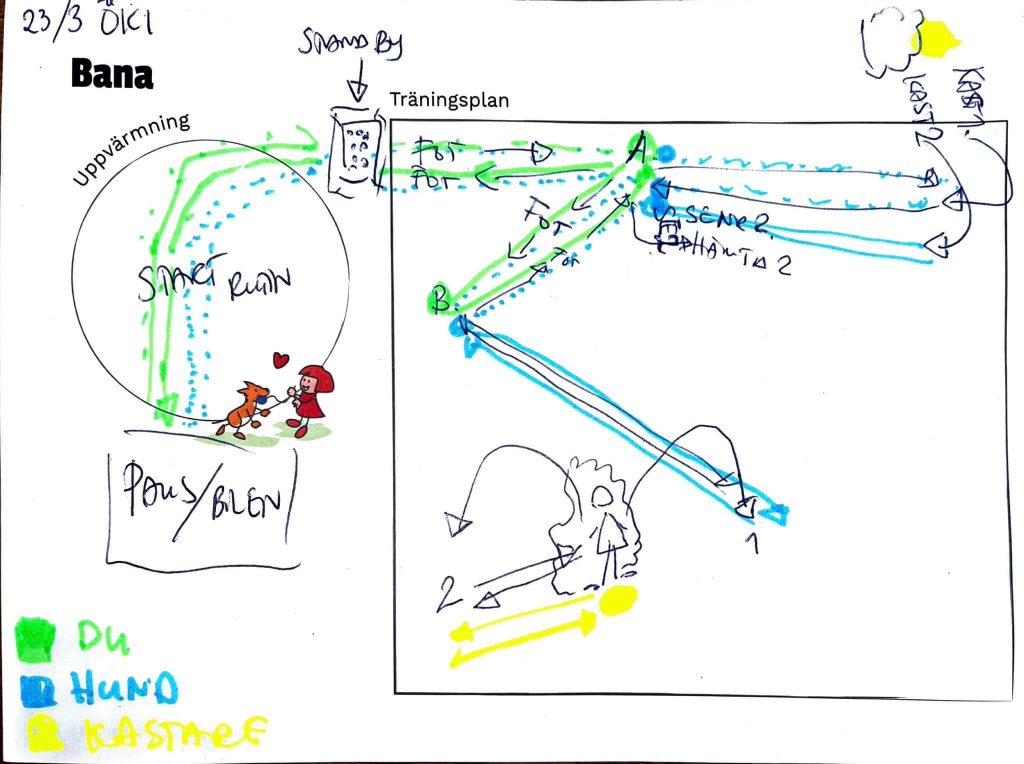 – Start rutin – den ni ska uppfinna jag brukar leka först sen göra ett trick – så hunden får explodutta lite och sen gå in i fokus (men det är din hunds behov som är prio)