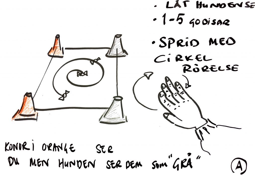 På samma sätt vill vi att hunden ska kunna förstå och jobba utifrån ditt direktiv med visselsignal. Inlärningen är att du gör med kopplat till att huden börjar söka – när hunden börjar göra jobbet visslar du din unika signal för arbetet ”sök där du står”. Nyttja att hunden redan kan handtecken för arbetet och vissla när hunden gör jobbet.
