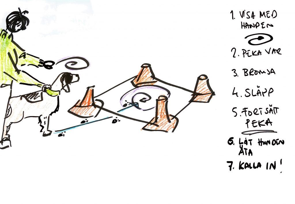 - skicka hunden till tydligt stopp – gå dit och belöna – så tillbaka – innan du ger tecken för Närsök