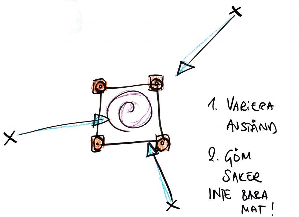 Vi börjar med att jobba in momentet NÄRSÖK i en liten triangel. Först på samma ställe, sen på ny plats. Senare ökar vi ökar antalet ytor och varierar vad vi gömmer. Så småningom växlar vi mellan ytor med föremål i och ytor utan.