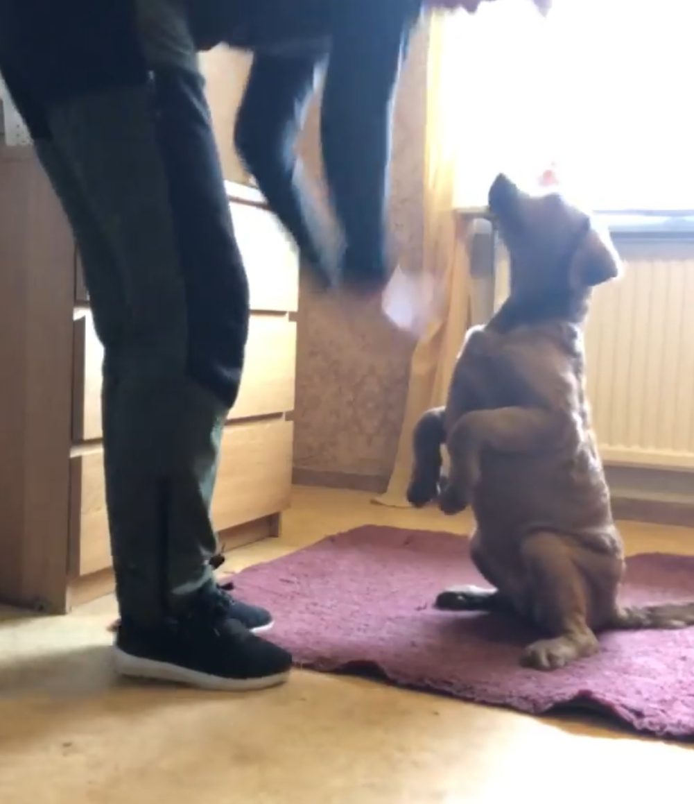 9. hoppa upp i sittande position från liggande position och sen upp på en pall med framtassarna