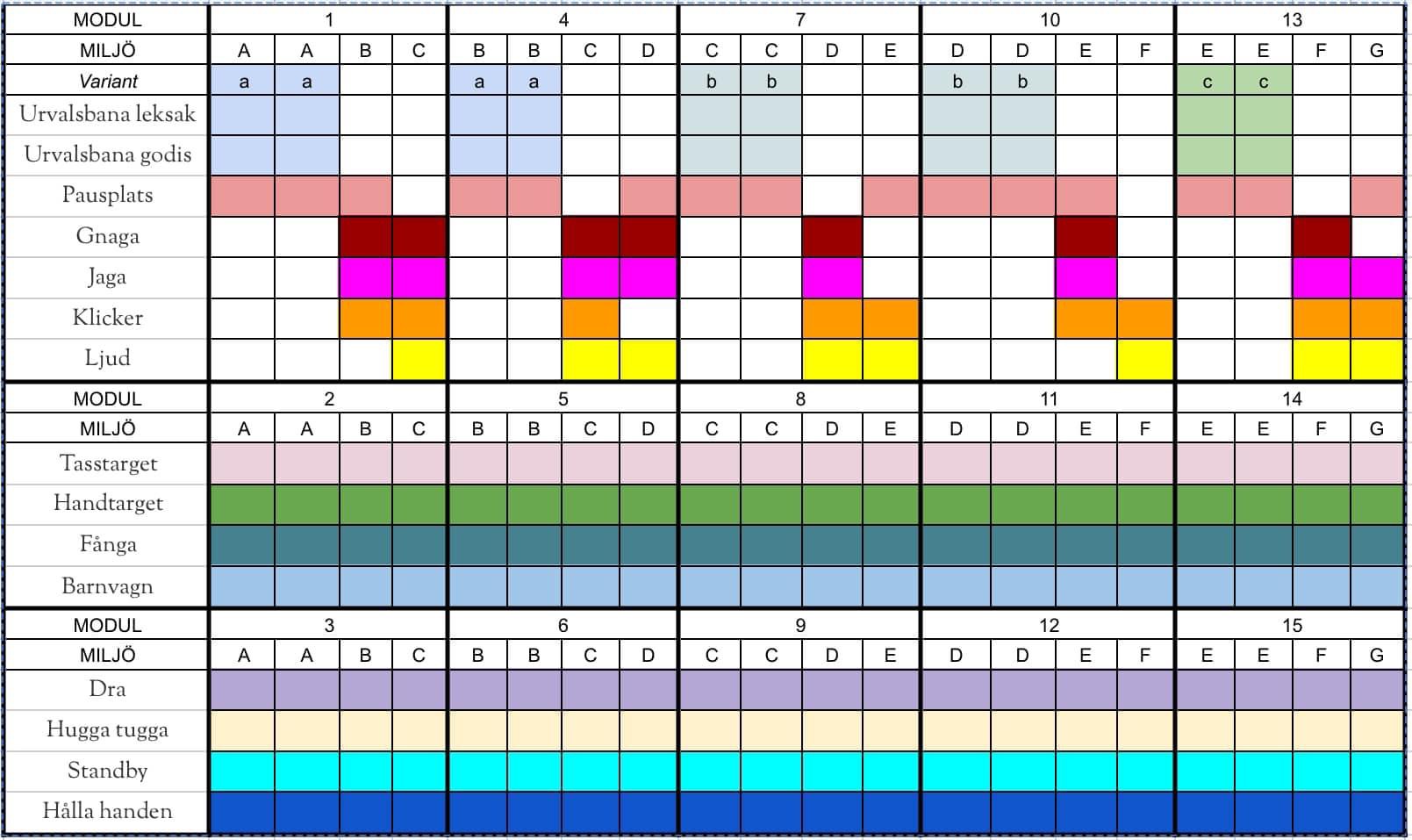 I detta schema skulle veckans bana vara Modul 1 och det är ljusblå och rosa som är prio att jobba med. Fungerar det utmärkt kan jag lägga till Gnaga, jaga, Klicker och ljud. Annars låter jag dem vara, jag kommer komma tillbaka hit i modul 4, så jag behöver inte vara orolig för att jag glömmer att träna det. Detta är poängen med moduler – att de kommer tillbaka så att jag inte missar att träna ett område jag tycker är tråkigt eller tror hunden redan kan.